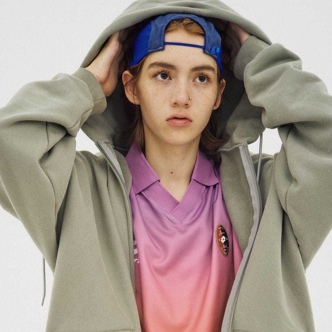 フード部分が二重になっていて、立体的な首元がポイントのフーディ。腰くらいのジャスト丈なので、裾から出るインナーの丈や色で着こなしの表情が変わる。丸みのあるシルエットもいい感じ。