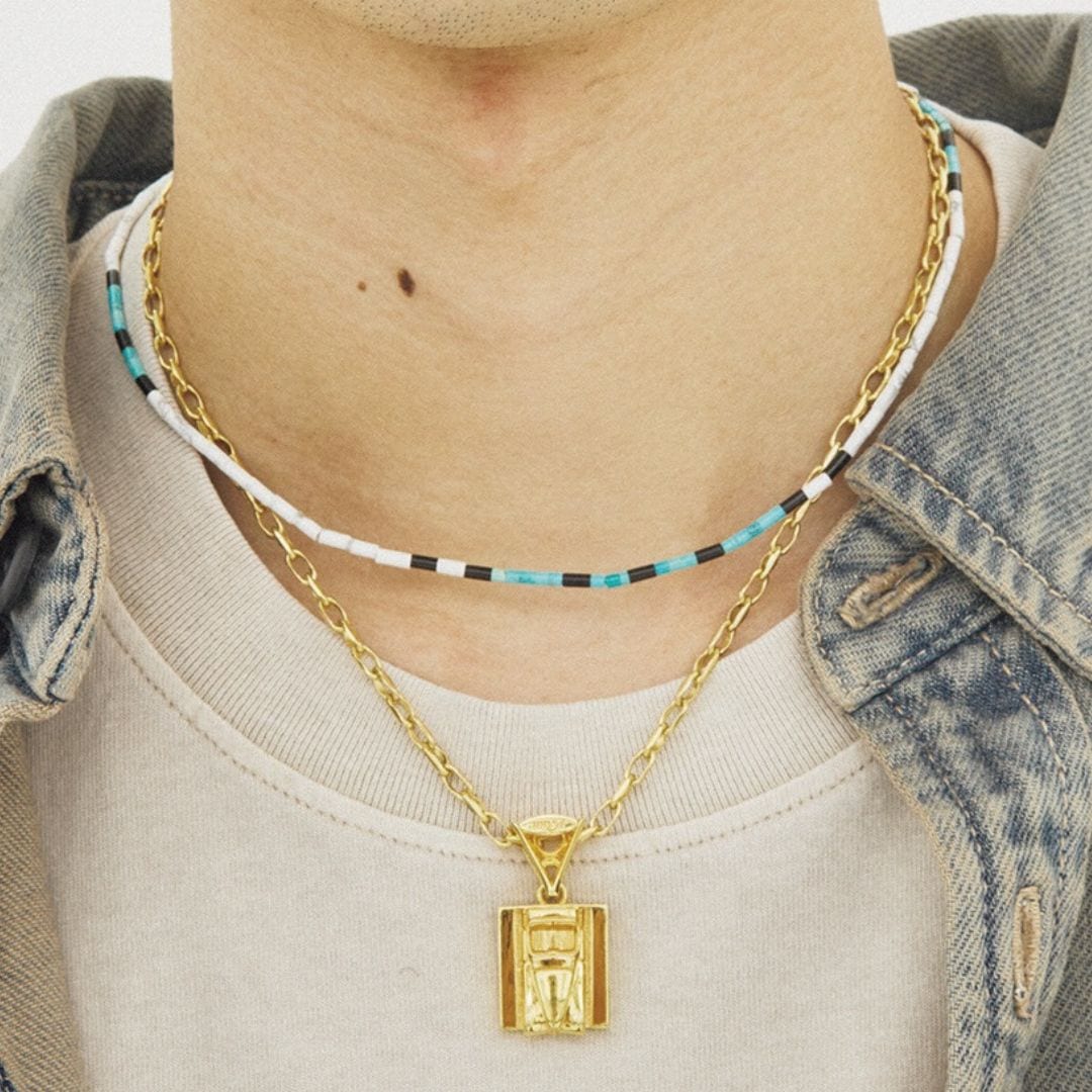 首元に彩りを与えるビーズネックレスは、主張が強すぎない細めが使いやすい。単品ではなくゴールドのネックレスと組み合わせると、より洒落た雰囲気を演出することができる。