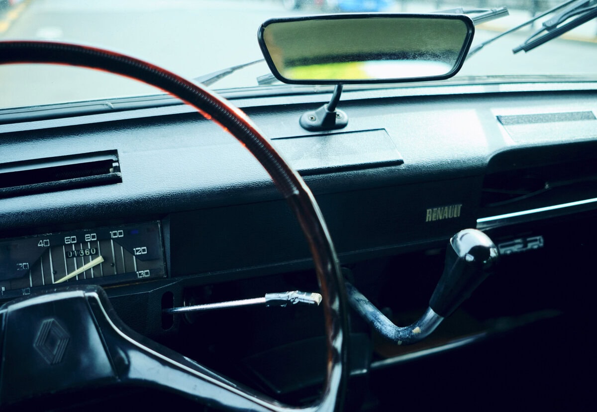 2人の車はシフトレバーがダッシュボードから突き出ているのが特徴。このL字型の鉄棒を押し/引き/左右に傾けることで変速する。