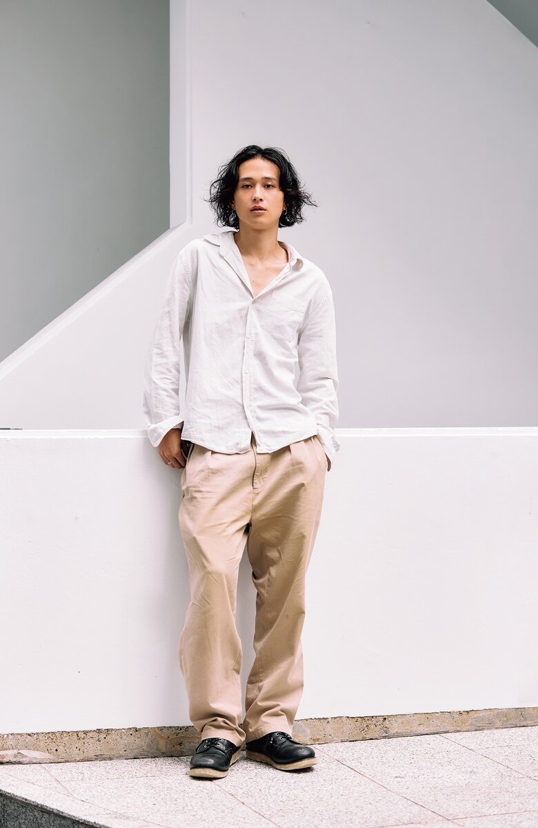 丸 重ね着はあまり好きじゃないので、さらっと袖を通して、だらだらっと着るのが好きです。自分そのままでいられる感じがして、こういうスタイルが自分らしいのかなと思っています。今日着ているシャツとチノパンはどこに遊びに行っても、汚れても別に気にならなくて。そのまま脱いで海に飛び込めるくらいでいるのが好きです。