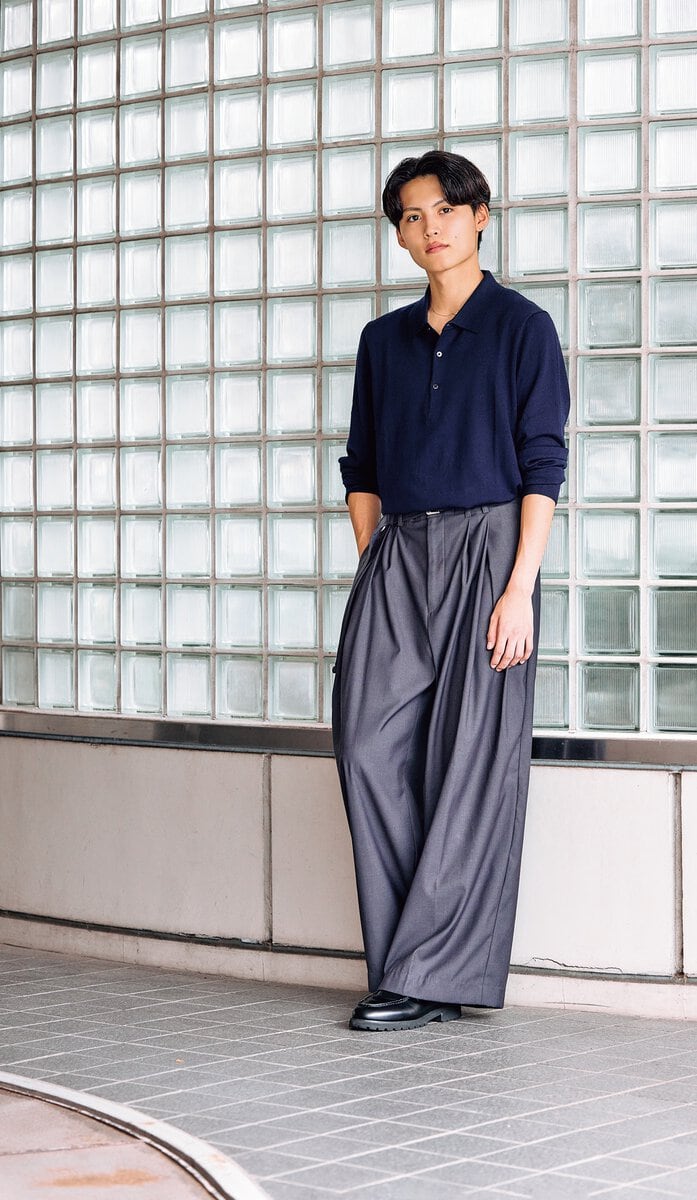 平山 コンパクトなトップスにワイドボトムを合わせたAラインシルエットです。ボトムはこういうタック入りやフレアシルエットが多く、ベルトでマークしたりスタイルがよく見えるコーデが好きですね。これからの時季はニットにシャツを合わせたり、色合わせを工夫してレイヤードを楽しみたいです。