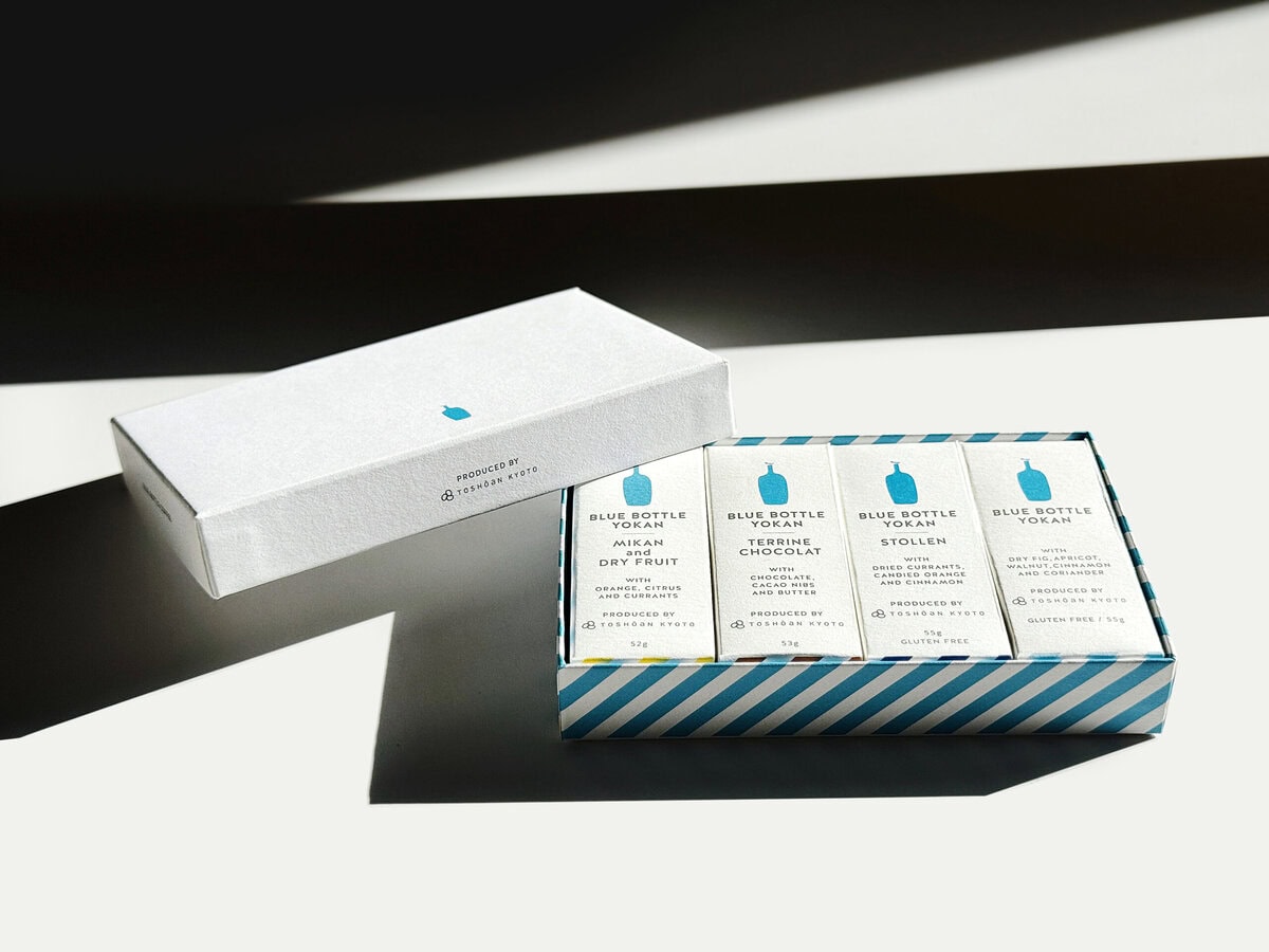 コーヒーブランドとして知られる「ブルーボトルコーヒー」が手がける和菓子のギフトセット。みかん&ドライフルーツ、テリーヌ ショコラ、ブルーボトル 羊羹、シュトーレン、4種の羊羹を、店舗にて別売りのギフトボックスに詰めてもらったオリジナルの詰め合わせセットです(オンラインではブルーボトル 羊羹4本ギフトボックス入りのみ販売)。