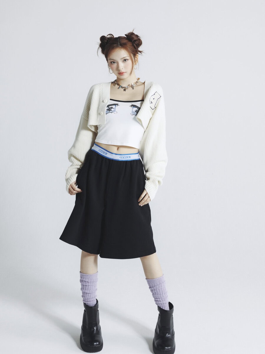 カーディガン¥15,950/ビームスボーイ(ビームスボーイ原宿☎03-5770-5550)、キャミ¥11,550/No dress(ともに9FOX Showroom info@9fox.ltd)、ハーフパンツ¥14,100/XOXOGOODBOY(HANA KOREA support@hana-korea.com)、ピアス各¥17,600 /e.m.(e.m.青山店☎03-6712-6797)、ネックレス¥40,700/Marland Backus(9FOX Showroom info@9fox.ltd)、ブーツ¥24,200/YELLO(YELLO https://www.yelloshoes.com)、靴下/スタイリスト私物