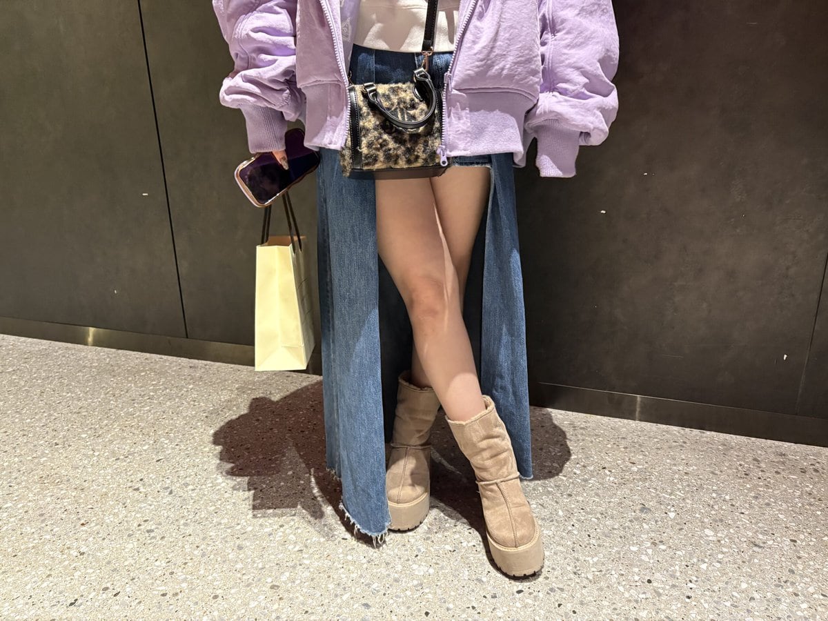 さやかさんは、GYDA(ジェイダ)のスカートがお気に入り。ミニスカートとロングスカートを重ねた個性的なデザインが、インパクト抜群!カジュアルながらも、ロングのデニム生地が揺れる様子はフェミニンな雰囲気を感じさせる♡ ブーツもしっかり見えて、足元の可愛らしさ◎です。