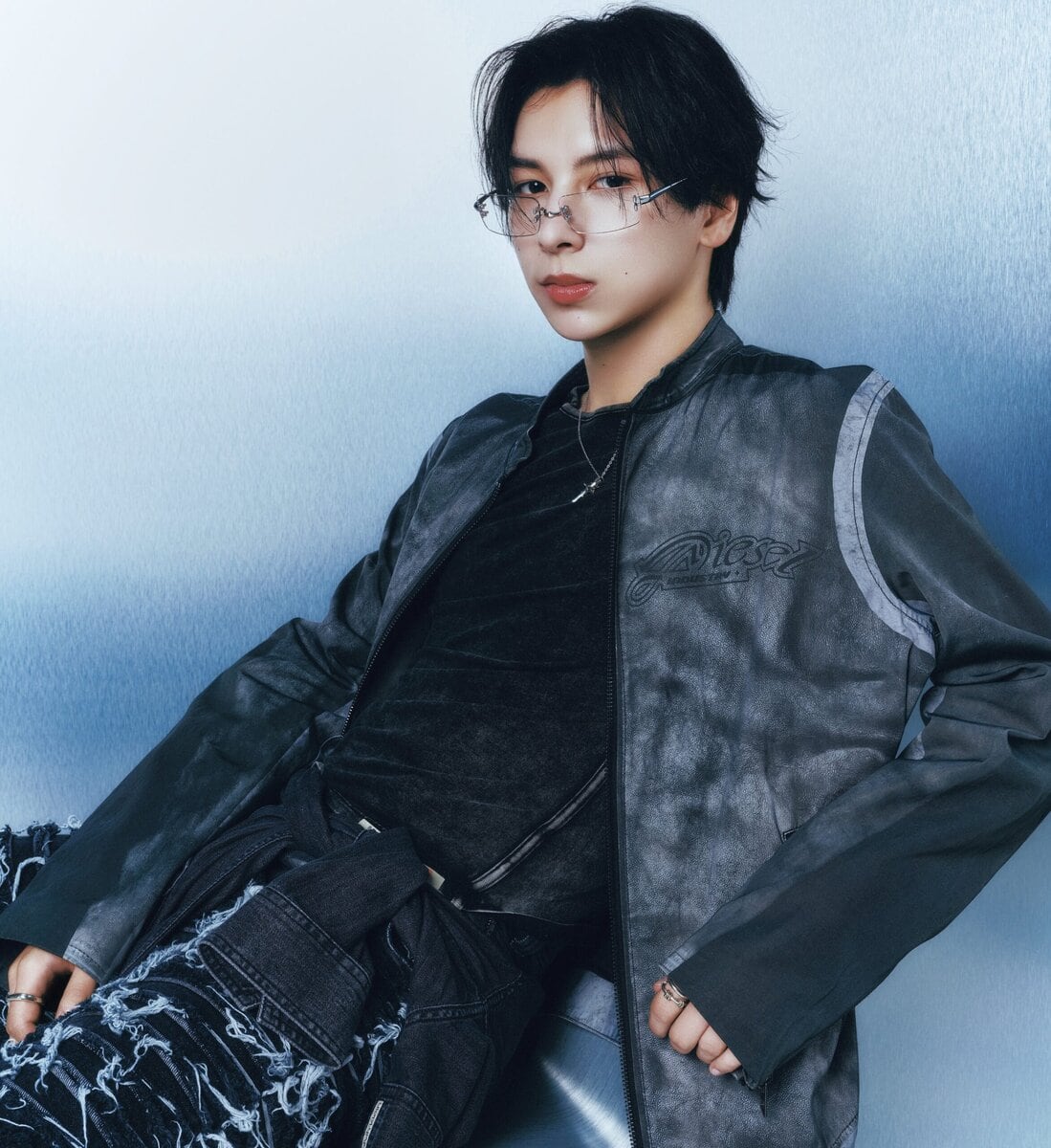 ジャケット¥71,500、ロンT¥14,300/ともにディーゼル(ディーゼル ジャパン☎0120-55-1978)、パンツ¥33,770/レシト(HANA KOREA support@hanakorea.com)、腰に巻いたシャツ¥23,100/カルバン・クライン(カルバン・クライン カスタマーサービス☎0120-657-889)、メガネ¥41,600/ジェントルモンスター(M☎03-6721-0406)、リング(右手)¥27,500/ラムダ(ラムダ☎0800-500-5000)、( 左手)¥26,400/ガルニ(ガルニ東京店☎03-3770-4554)、ネックレス¥47,300/ジャスティン デイビス(ジャック・オブ・オール・トレーズ プレスルーム☎03-3401-5001)