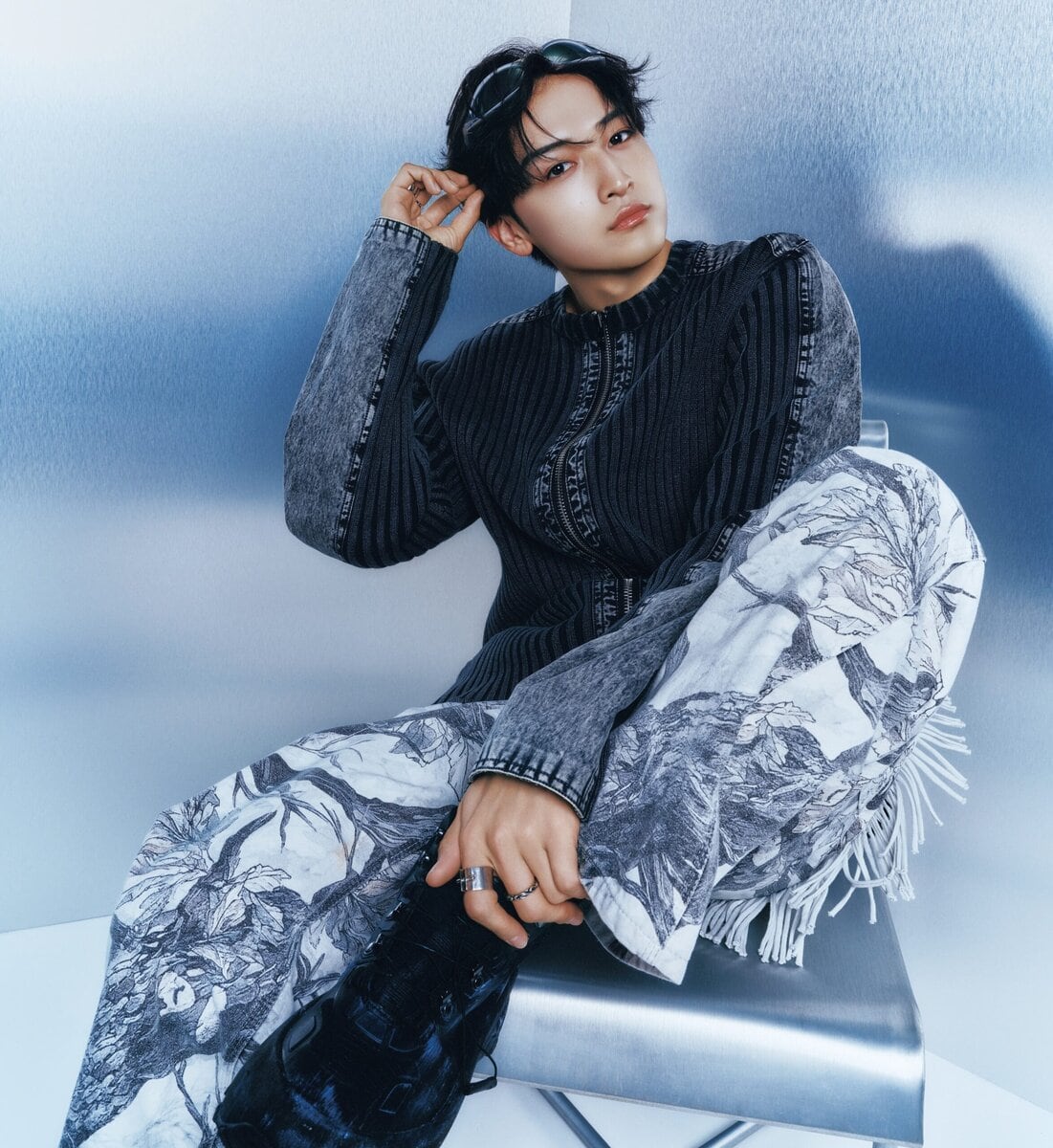 ジップニット¥72,600、スニーカー¥59,400/ともにディーゼル(ディーゼル ジャパン☎0120-55-1978)、パンツ¥37,400/ア ベイシング エイプ®️(ベイプ ストア®️原宿☎03-5474-0204)、腰に巻いたフリンジスカーフ¥8,240/アスラ(HANA KOREA support@hana-korea.com)、リング(右手・中指)¥33,000、(右手・薬指)¥137,500/ともにジャスティン デイビス(ジャック・オブ・オール・トレーズ プレスルーム☎03-3401-5001)、(左手・人差し指)¥33,000/ヨハン シルバーマン(ティーニー ランチ☎03-6812-9341)、(左手・中指)¥16,500/ライオンハート(シアン PR☎03-6662-5525)、サングラス¥51,100/ジェントルモンスター(M☎03-6721-0406)