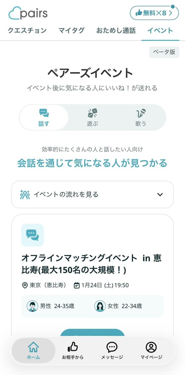 ↑Pairsでは定期的にイベントを開催してます。開催中のイベントはアプリ内の「イベント」タブで確認できます。