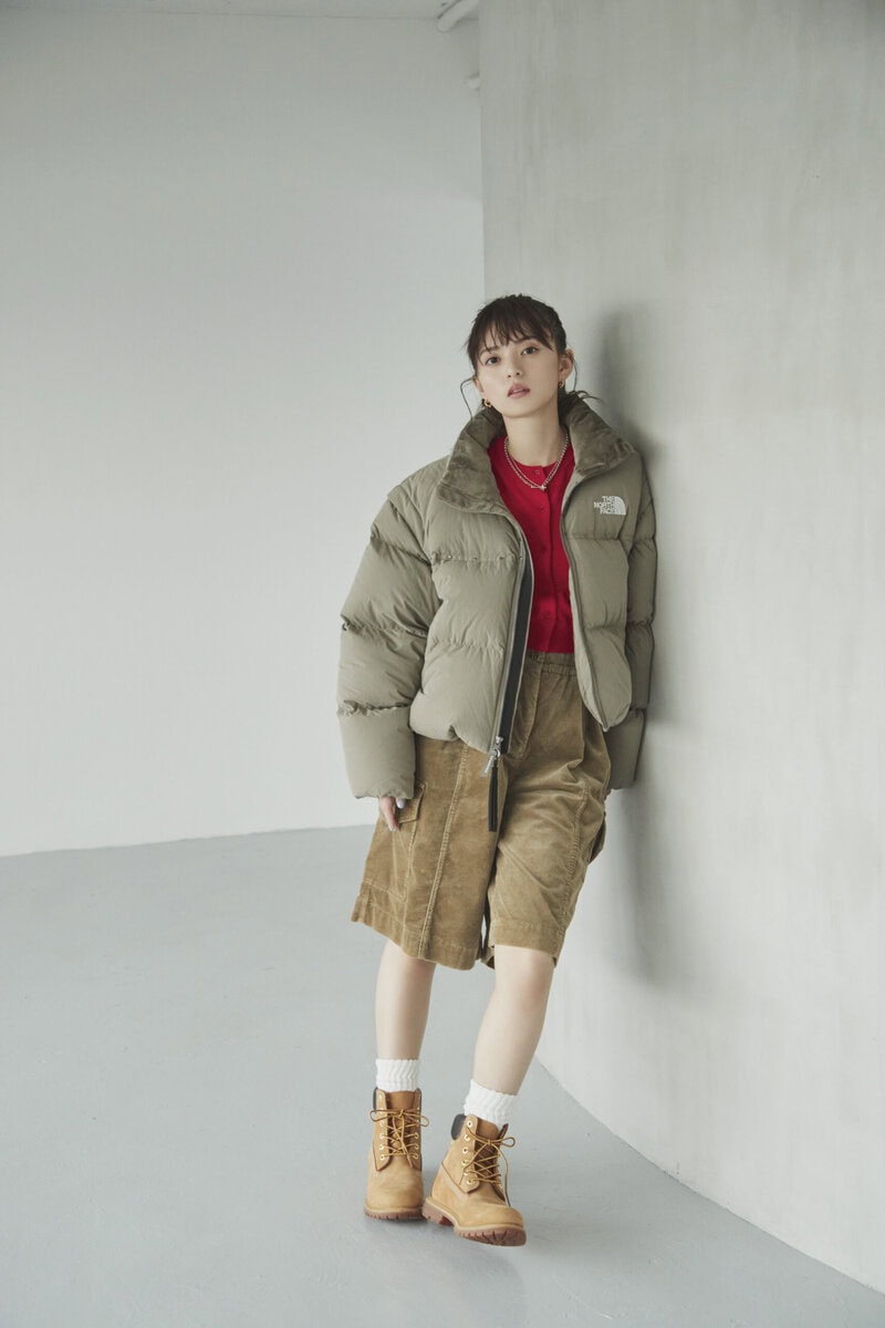 (写真上)ダウン¥49,500/ザ・ノース・フェイス(ゴールドウイン カスタマーサービスセンター☎0120-307-560)、カーディガン¥31,900/アモーメント(アモーメントcs@amomento.jp)、ハーフパンツ¥44,000/バウム・ウンド・ヘルガーテン(エスアンドティ☎03-4530-3241)、ネックレス¥26,400/ジュスティーヌクランケ(ザ・ウォールショールーム☎︎050-3802-5577)、ピアス¥22,000/エテ(エテ☎︎0120-10-6616)、ソックス¥990/タビオ(靴下屋☎0120-315-924)、ブーツ¥30,800/ティンバーランド(VF ジャパン☎0120-558-647)