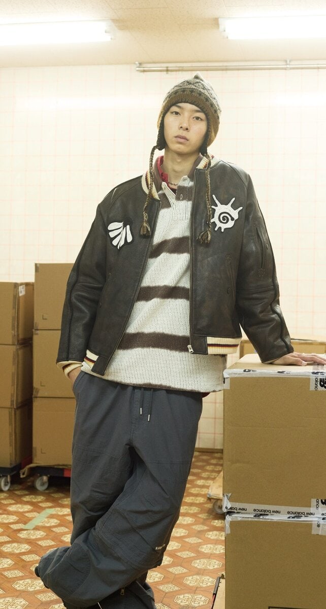 レザーヴァーシティジャケット¥132,000/ FAF(FAF info@fakeasflowers.com)、ニットラグビーシャツ¥37,400/ナパ バイ マーティンローズ(ディプトリクス☎︎03-5464-8736)、パンツ¥34,100/ア ベイシング エイプ®︎(ベイプ ストア 原宿☎︎03-5474-0204)、シャツ¥26,400/オンブレニーニョ(エス☎︎03-6459-2105)、ニットキャップ¥7,700/セダン オール パーパス(セダン オール パーパス☎︎03-5775-3383)、スニーカー¥19,300/ナイキ スポーツウェア(NIKE カスタマーサービス☎︎0120-6453-77)