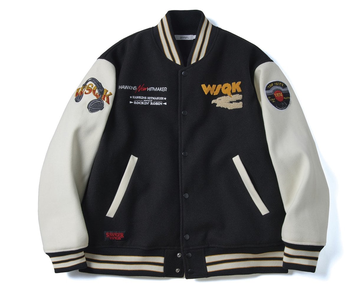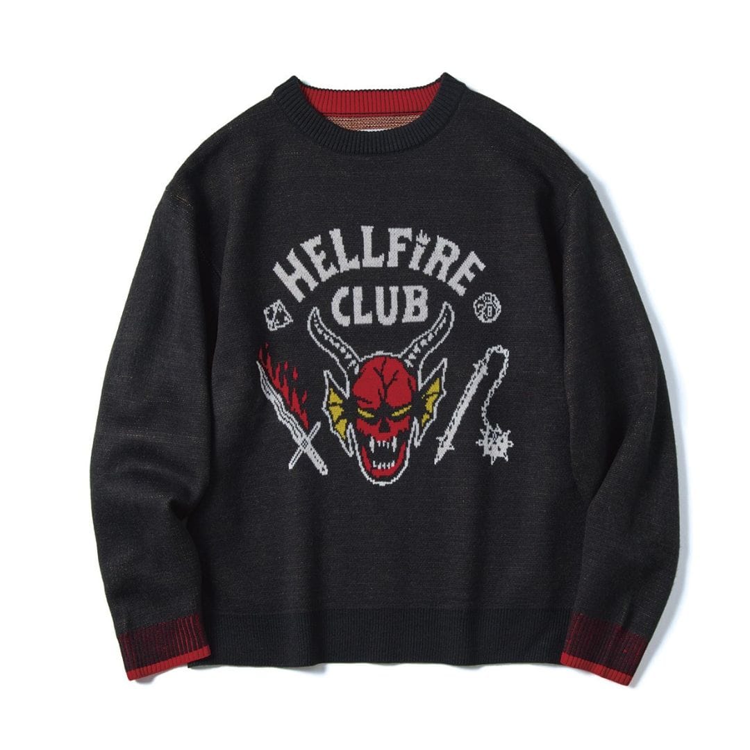 スタジャンはラジオ局「The SQUAWK」の刺しゅうやワッペンがポイント。バックスタイルも抜け目なし。ニットはホーキンス高校の部活「ヘルファイア・クラブ」のロゴがインパクト大。ドロップショルダーでゆったり着こなせる。スタ