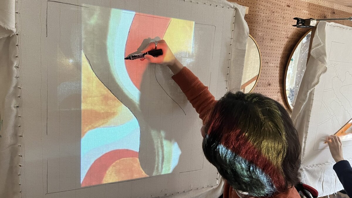 描きたい絵や図案をプロジェクターで布に投影して、マジックでなぞります。前日までにデザインを送ることになっていたのですが、ほかの参加者の様子を見てみると、模様・イラスト・自分で書いた絵など様々!