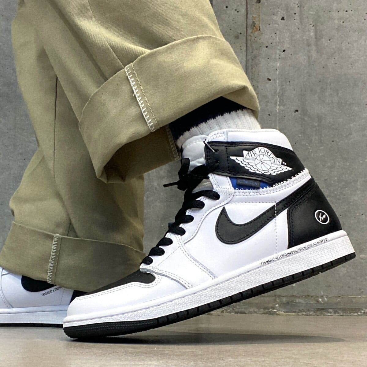 アッパーは潔いホワイトとブラックのコンビネーション。どんなスタイルにも合わせやすい王道カラーですが、それだけでは終わりません。アンクルフラップの下にはロイヤルブルーのアクセントがさりげなく入っています。このブルーが入ることで、一気に表情が引き締まり、どこかfragmentらしいムードが漂います。モノトーンの中にひそむ鮮やかな差し色が、履く人の個性をさりげなく引き立ててくれます。