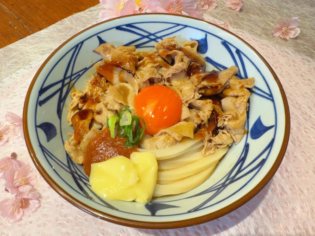 まずは今春完全新作の「こく旨 豚玉ぶっかけうどん」から実食!丼の中にはたっぷりの豚バラ肉がドドンっと鎮座しています。