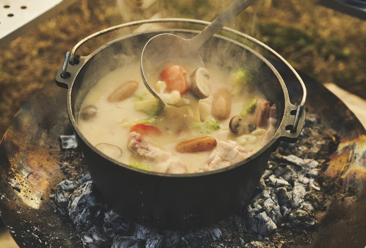 煮込み料理だけでなく、焼く・蒸すのもお手のものなダッチオーブンは、もはやキャンプ飯のマストアイテムだ。植物性オイル仕上げですぐに調理を始められる手軽さがいい。ファイアーディスクは焚き火台としてはもちろん、こうして料理に応用してもOK。