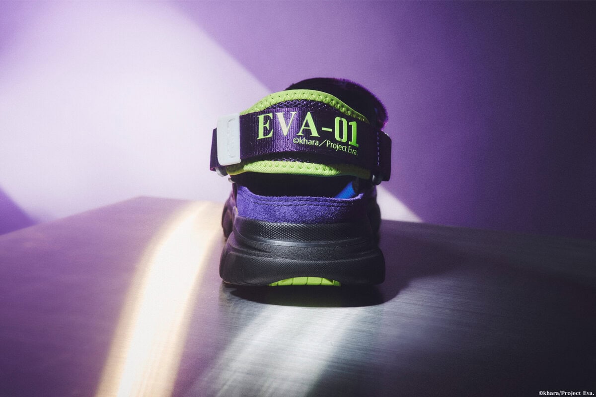 さらに、機体名をプリントしたスペシャルな踵ストラップでアレンジ。テープエンドパーツと金具フックには蓄光素材を採用し、暗闇でほのかに光るギミックが『エヴァンゲリオン』の世界観を表現する。
