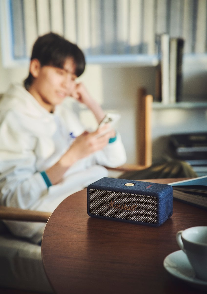 クリアでバランスのとれたMarshallシグネチャーサウンドによって、どんな音量でもきれいなサウンドが楽しめる。最大32時間の連続再生に対応。内蔵マイクを搭載しハンズフリー通話もできる。IP67の防塵・防水性能を搭載しアウトドアでも活躍。操作部はトップにまとめられており、バッテリー残量もわかる。「ネイビーブルーとゴールドメッシュの組み合わせがおしゃれです。外にもお風呂にも持っていきたい!」(smartモデル・平山くん)