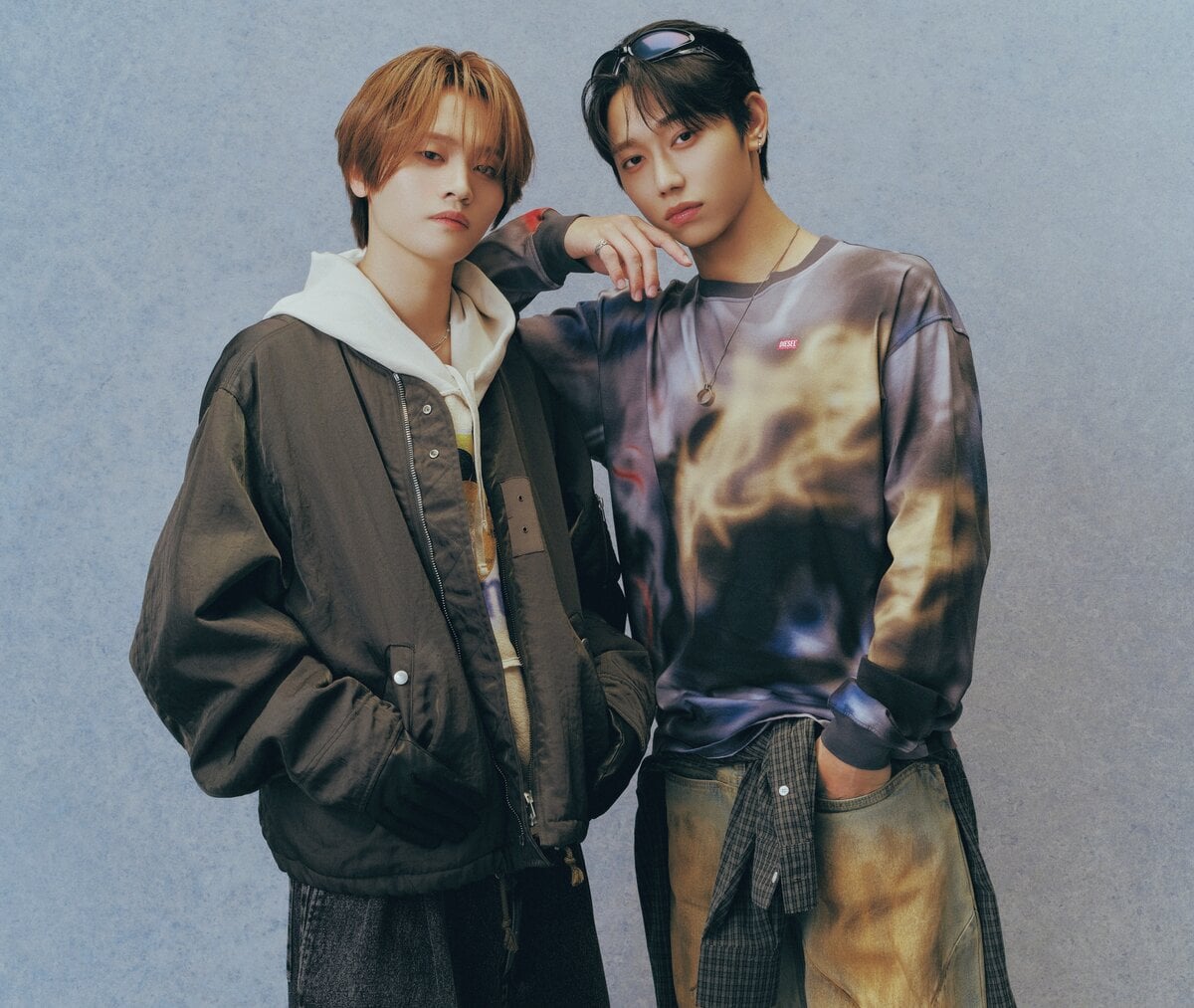 【左・KAIRYU】フライトジャケット¥53,350/ボンロウ(HANA KOREA)、フーディ¥36,300/ボディソング(ティーニー ランチ)、デニムパンツ¥61,600/リコール(エスティーム プレス)、ネックレス(上)¥27,500、(下)¥30,800/ともにラムダ(ラムダ)、ブーツ¥45,000/ティンバーランド(VF ジャパン)