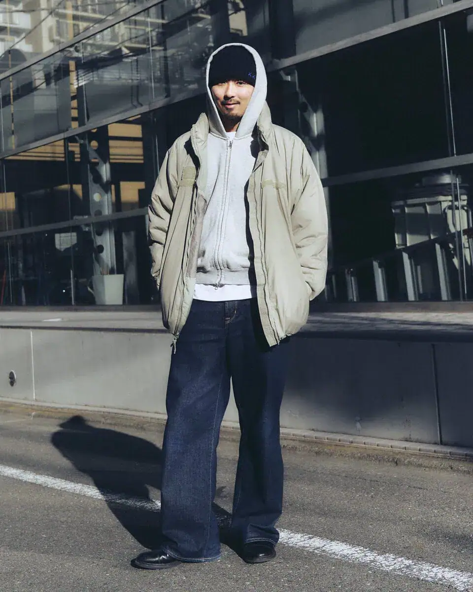 今日の着こなしポイント:ジャストサイズのフーディーに白teeをレイヤードしたのがポイント。パンツはルーズなシルエットでバランスをとりました。カジュアルになりすぎないように足元は革靴をチョイスしました!