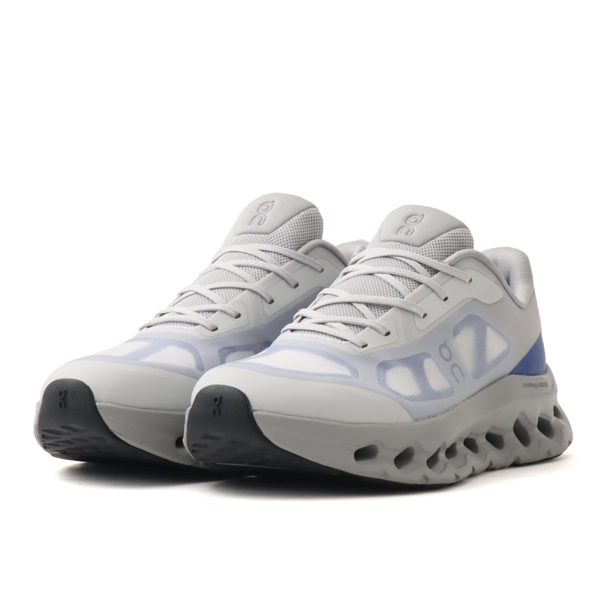 シースルー素材を何層にも重ねたオーバーレイは、まるでレントゲンアートのような緻密さが特徴。縫い目のないデザインとカットアウトしたOnロゴのコンビもテクニカルな印象を強め、淡く柔らかなブルーカラーは明るい色が主軸とした春コーデによくハマる。