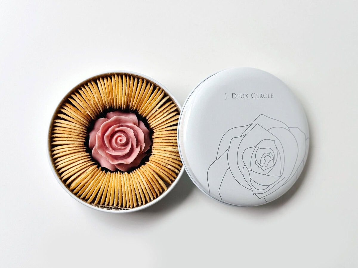 ふたを開けた瞬間、春がほどけていくような華やかさのあるラングドシャ。繊細に重ねられたラングドシャが円を描くように並べられていて、その中心には、やわらかな薔薇のチョコレートが添えられています。まるで、花が静かに咲く瞬間を閉じ込めたような一缶です。