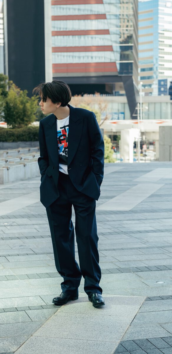 スーツ¥440,000/マキシミリアン モグ(ビームスF☎03-3470-3946)、Tシャツ¥39,800/ヴィンテージ”The Jam”(ラボラトリー® ☎03-5414-3190)、その他スタイリスト私物