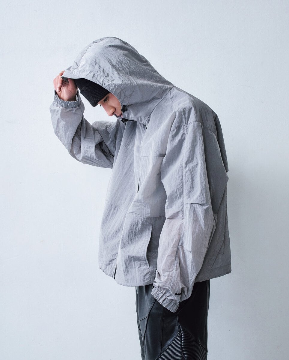 シアーな素材感がストリートで映えるフード付きテックジャケット