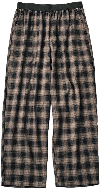 ワイドなシルエットに、ウエスト部分はゴム仕様、肌離れがよくドライなタッチの生地を使用した、パジャマモチーフのパンツ。春先から夏の暑くなる季節を快適に過ごせるアイテムだ。落ち着いたトーンのチェック柄で、子どもっぽくなることなくコーディネイトが可能。同生地のフーディシャツと合わせて、セットアップで着るのもオススメ。サッと着られて一枚で様になるので、移動が長い旅行や着替えがあるジムのお供にも◎。