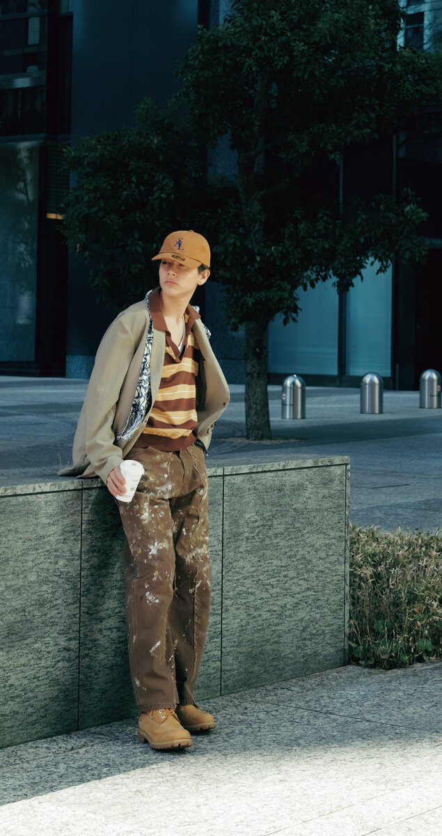 ジャケット¥35,200/デサント オルテライン アイオー(デサントお客様相談室☎0120-46-0310)、ポロシャツ¥14,300/エディフィス(エディフィス 新宿店☎03-5366-5481) 、パンツ¥52,800/オールド パーク(HEMT PR☎03-6721-0882)、キャップ¥13,200/サルマン(プレイモンキーinfo@playmonkey.inc)、スカーフ¥49,500/アット ヴァンヌッチ(ビームスF ☎03-3470-3946)、ブーツ¥30,800/ティンバーランド(VF ジャパン☎0120-558-647)
