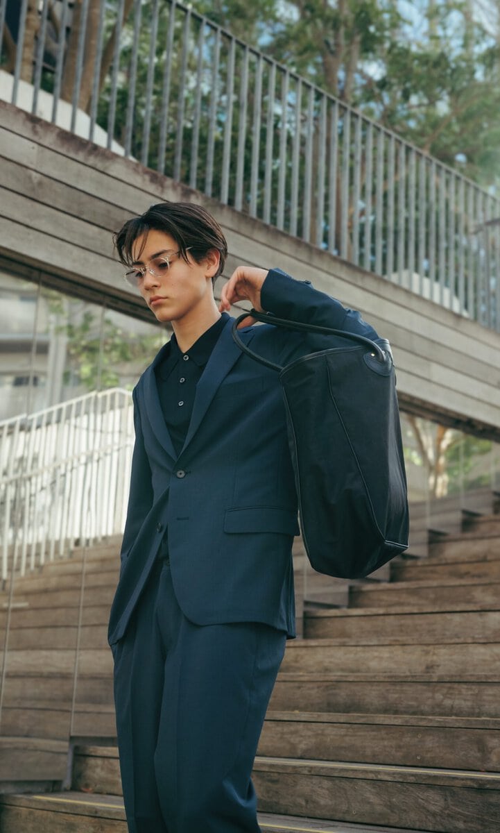 ニットポロ¥58,300/ジョン スメドレー(リーミルズ&カンパニー☎03-6277-5715)、ジャケット[TV150AJR246]¥10,780、パンツTV150ASR246]¥5,478/ともにトップバリュ(トップバリュコールセンター☎0120-28-4196(受付時間 10:00~17:00〈日曜日は除く〉※本州・四国・九州のイオン・イオンスタイルでの取り扱い。店舗によりお取り扱いのない場合がございます。詳しくはwebサイトでご確認をお願します)、サングラス¥52,800/ E5 アイヴァン(アイヴァン PR☎03-6450-5300)、カバン¥27,500/ヤング & オルセン フォー グリーンレーベル リラクシング(グリーンレーベル リラクシング 自由が丘店☎03-5731-8531)