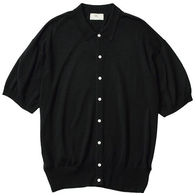 シルク100%素材を贅沢に使用。小ぶりのポロ襟や控えめなボタンが品のよさを押し上げ、ドロップショルダーのリラックスしたシルエットをリブで引き締める。シンプルなデザインで素材のよさが引き立つ。