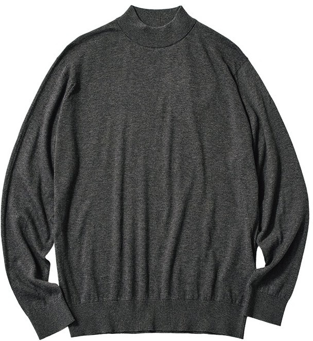 襟の高さは控えめに、自然に流れるようなシルエットを描くモックネックニットは、クラシックすぎずこなれた印象。緻密に編まれた30ゲージニットで、シルクのような光沢感と滑らかな肌触りがある。