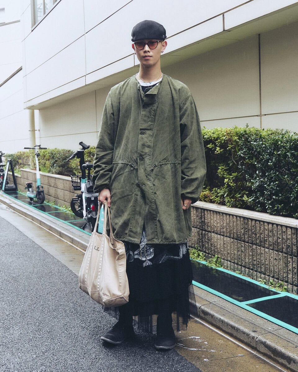 今日の着こなしポイント:全体的にゆったりとしたシルエットを意識しつつ、ミリタリーのアウターに対してスカートを合わせることでカジュアルな印象になる組み合わせにしました。