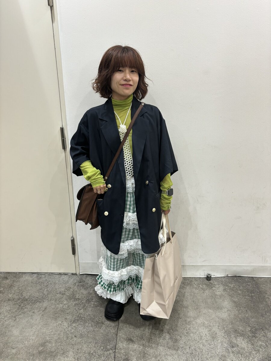 パンツの上に重ねているアイテム、本来はビスチェで着るものなんです。だけど、顔周りにフリルがありすぎるとガーリーになりすぎるかな?と思い、このように合わせてみました。ジャケットを羽織って、バランスを整えています!