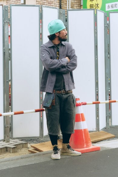 【スナップ】「難易度の高い総柄ノーカラーシャツは、黒で無地の短丈ベストを重ねれば自然と着こなせる」説を証明