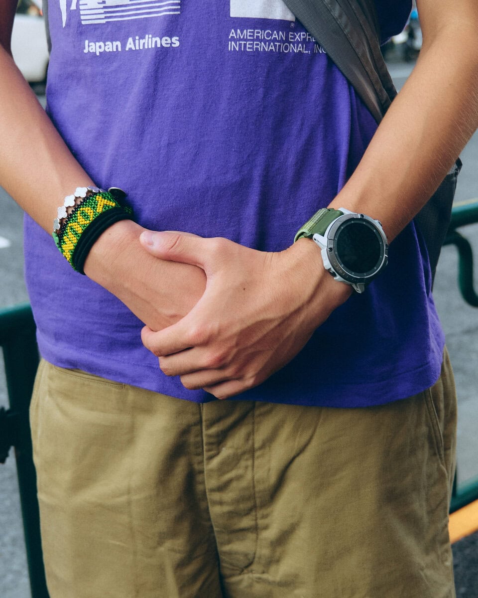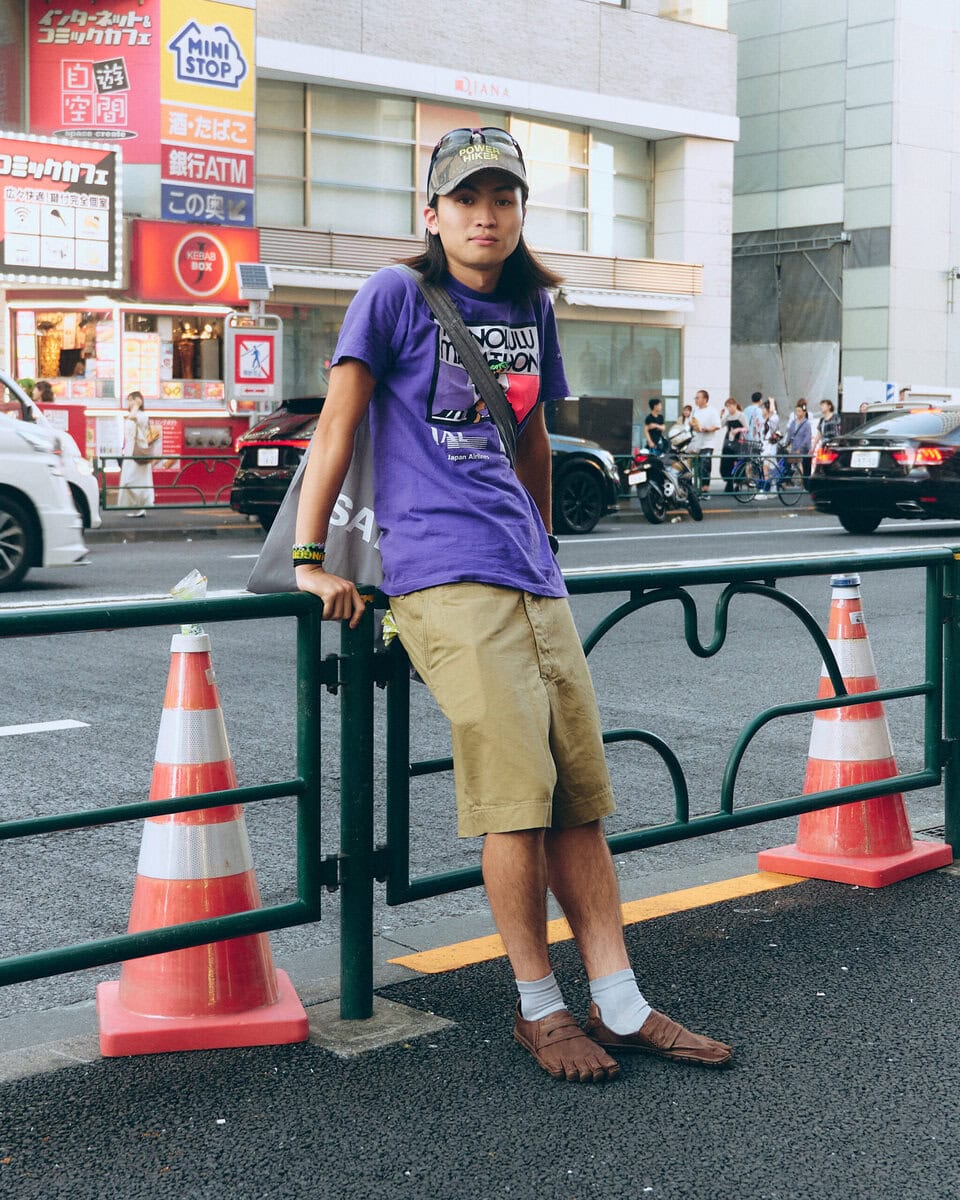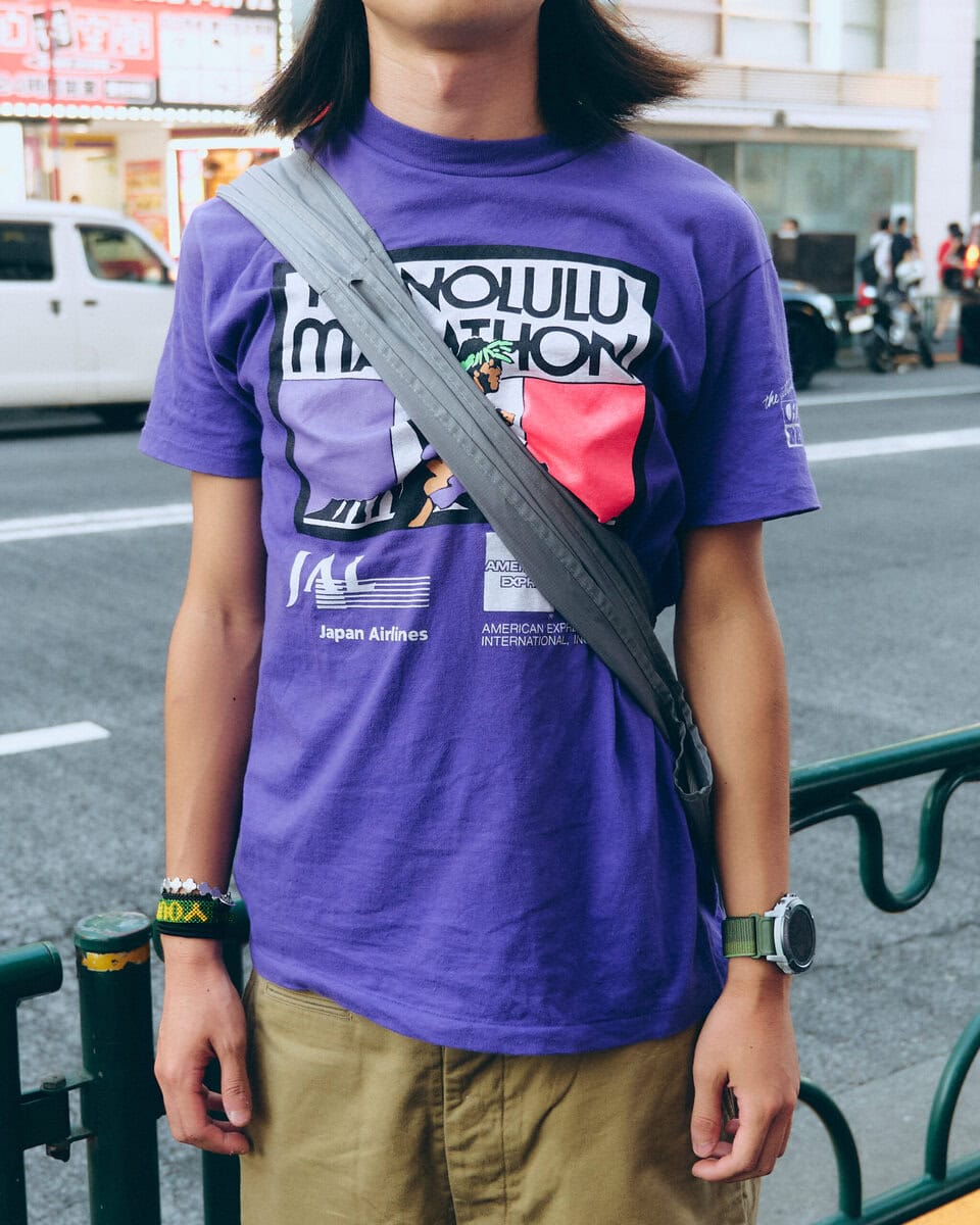 今日の着こなしポイント:日頃走っていて、ヴィンテージのマラソンTシャツを集めている。このTシャツは友達のハワイ土産で、その友達と遊びに行くので着てきた。キャップもまたポイント。つい先日フランスのシャモニーに遊びに行って、そこのショップで無料配布していたもの。最近リアルツリー柄のキャップをなくしたからタイミングがよかった。カジュアルなファッションが好きなので、足元はカジュアルだけど素材はレザーというバランスがちょうどいい。
