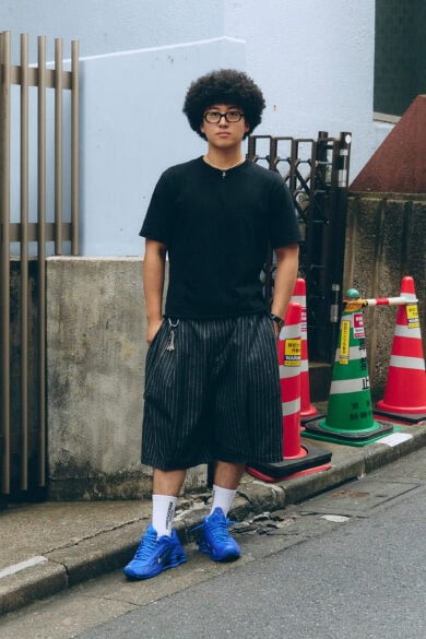 【スナップ】足元は色鮮やかなブルーと“あのクリエイター”のソックス…アフロヘア×黒縁メガネにも負けないインパクト