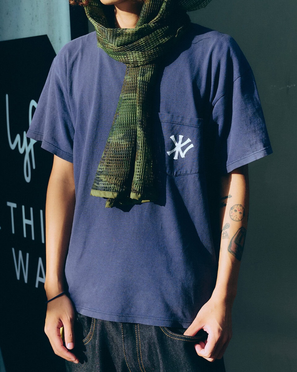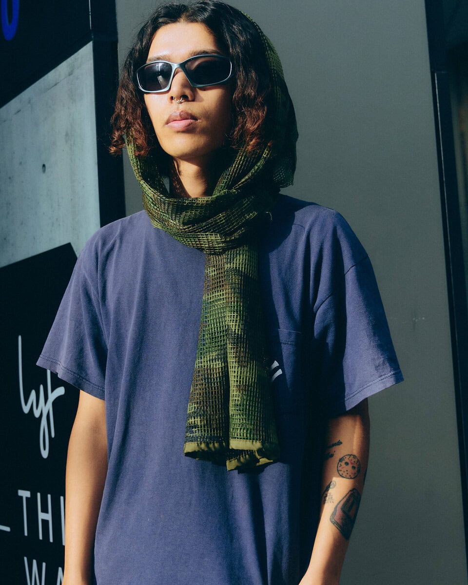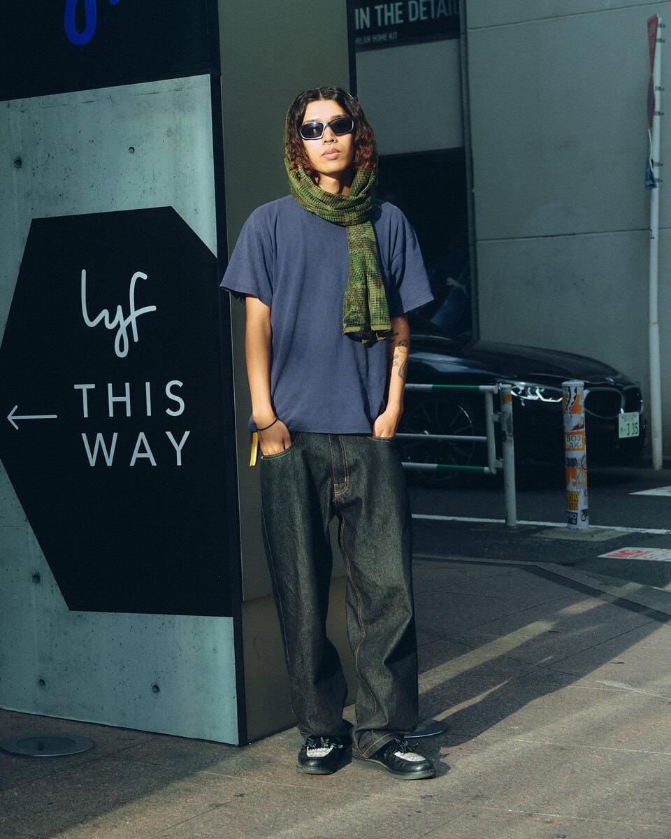 今日の着こなしポイント:シンプルなTシャツとデニムだったので、スナイパーベールを頭に巻きました!カモ柄なのでコーデのアクセントになります。