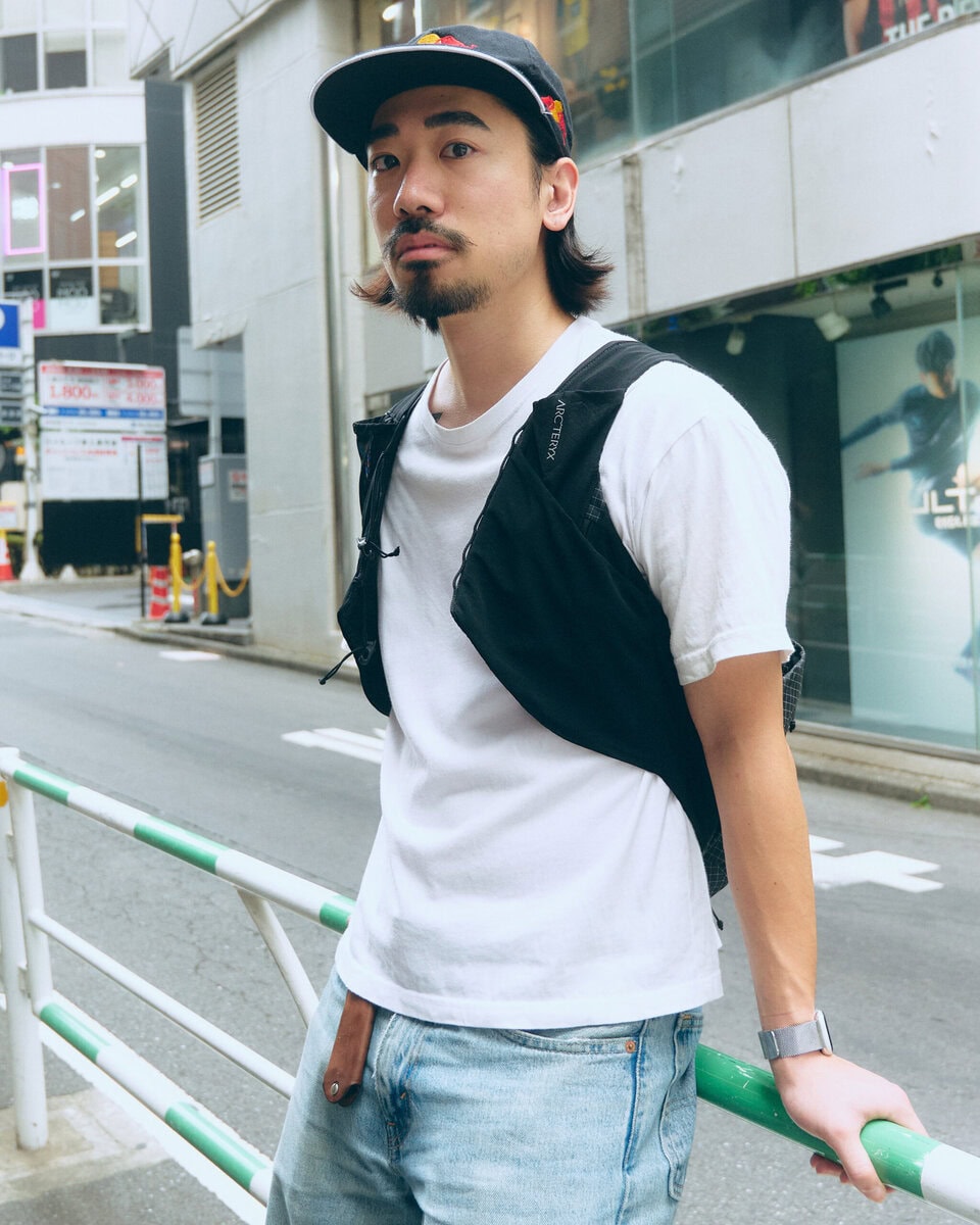 今日の着こなしポイント:普段からバイクに乗るので乗りやすさ、あと美容師なので動きやすさ、シンプルに王道のデニムに白Tでまとめました。で、キャップだけ少し遊びを。