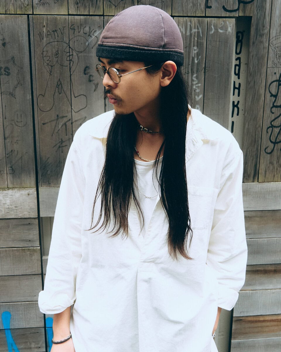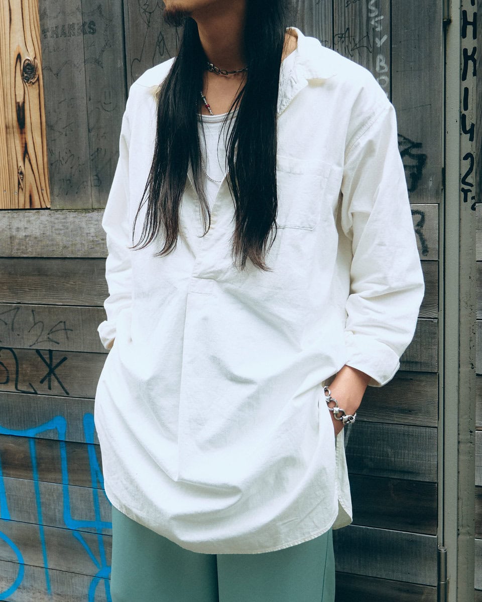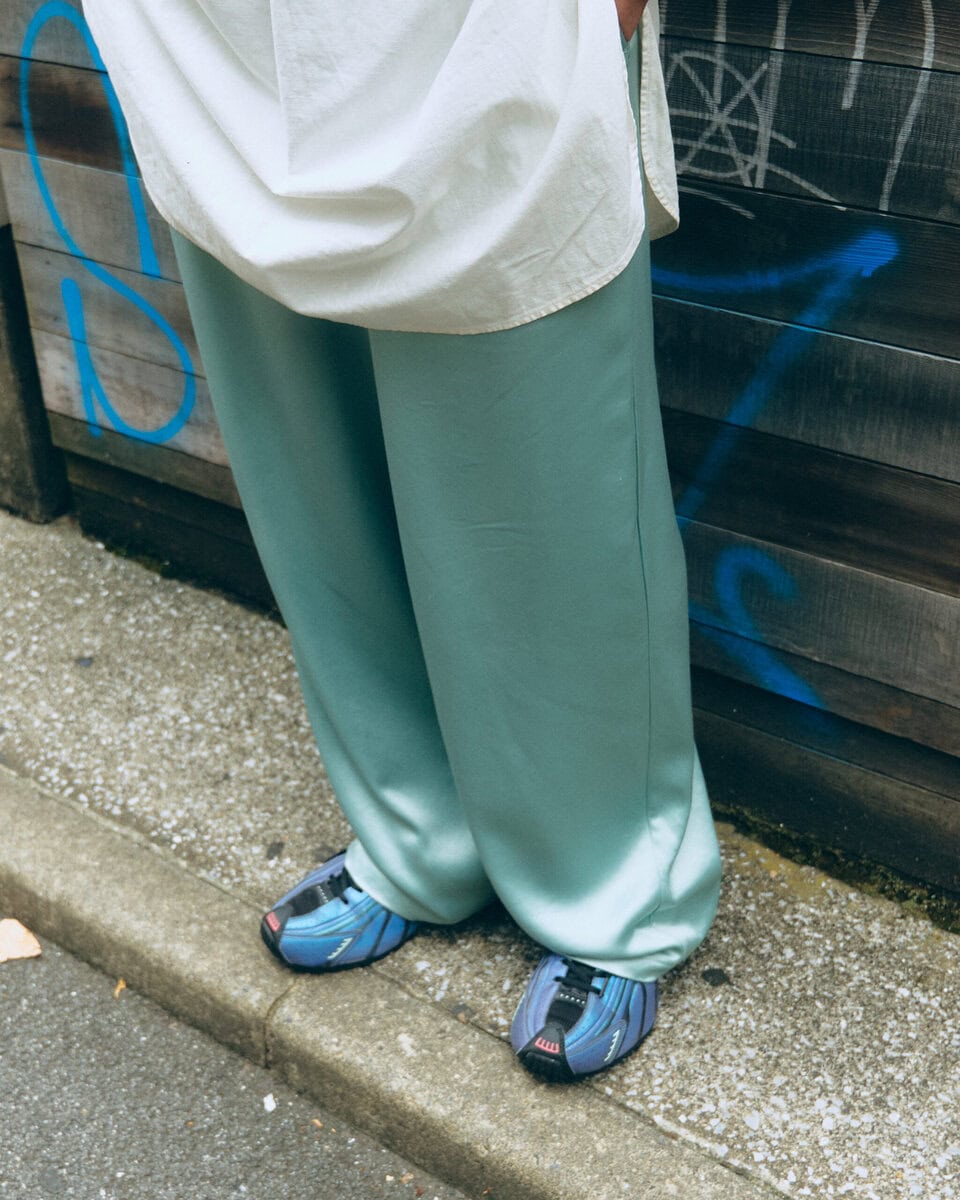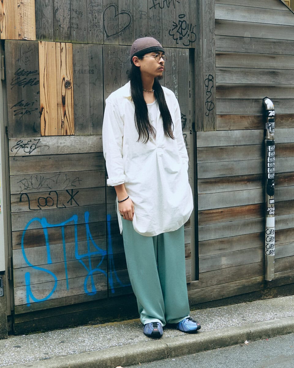 【スナップ】グランパシャツのユルさと上品な質感のサテンパンツ…計算された“違和感”が光る