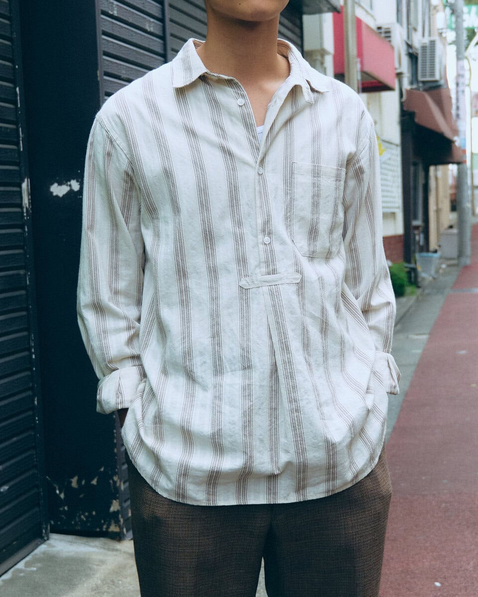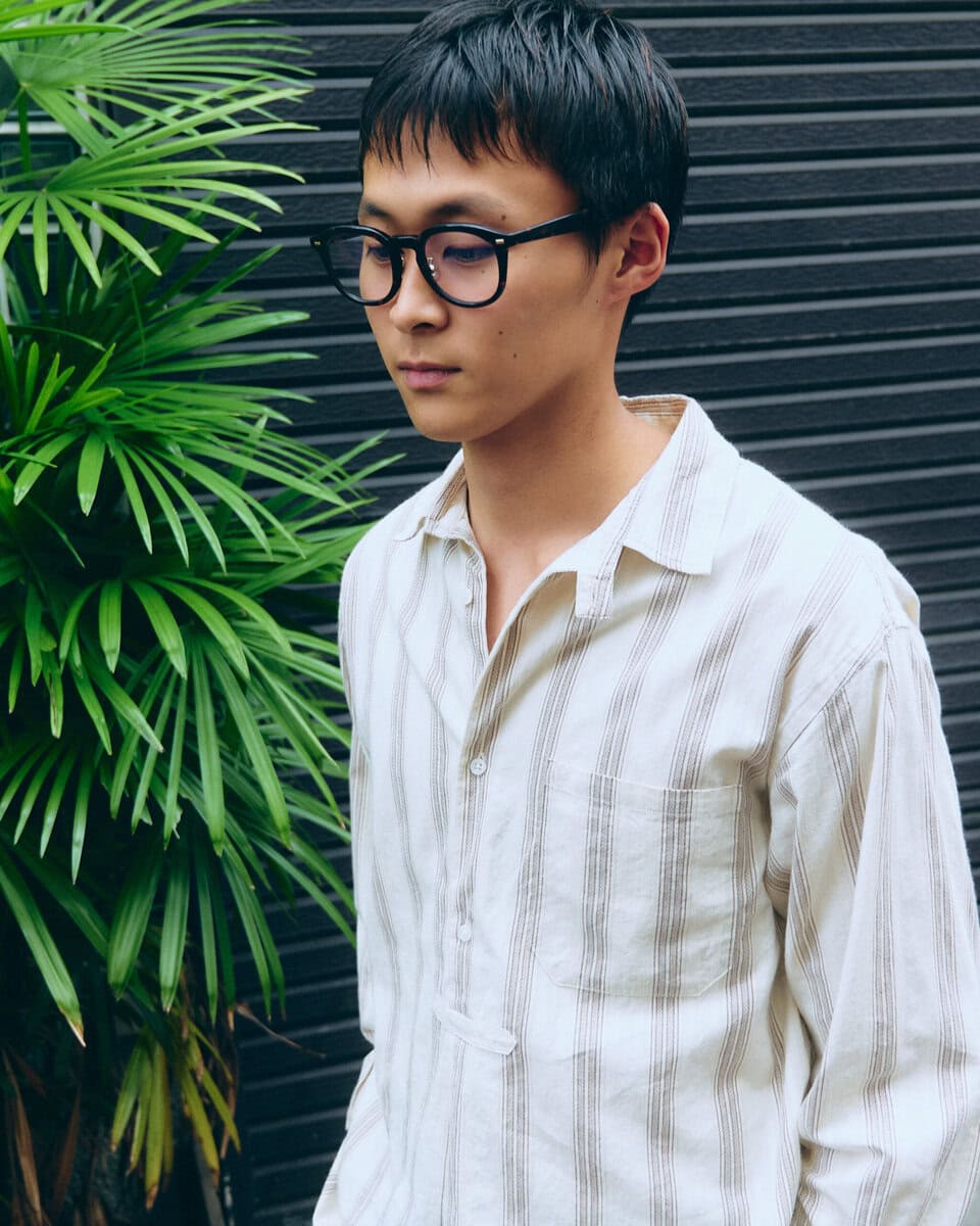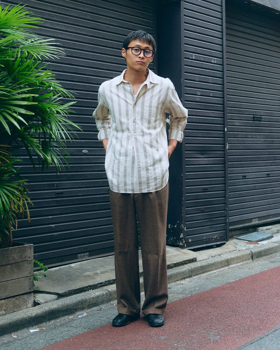 【スナップ】グランパシャツのユルさと上品な質感のサテンパンツ…計算された“違和感”が光る