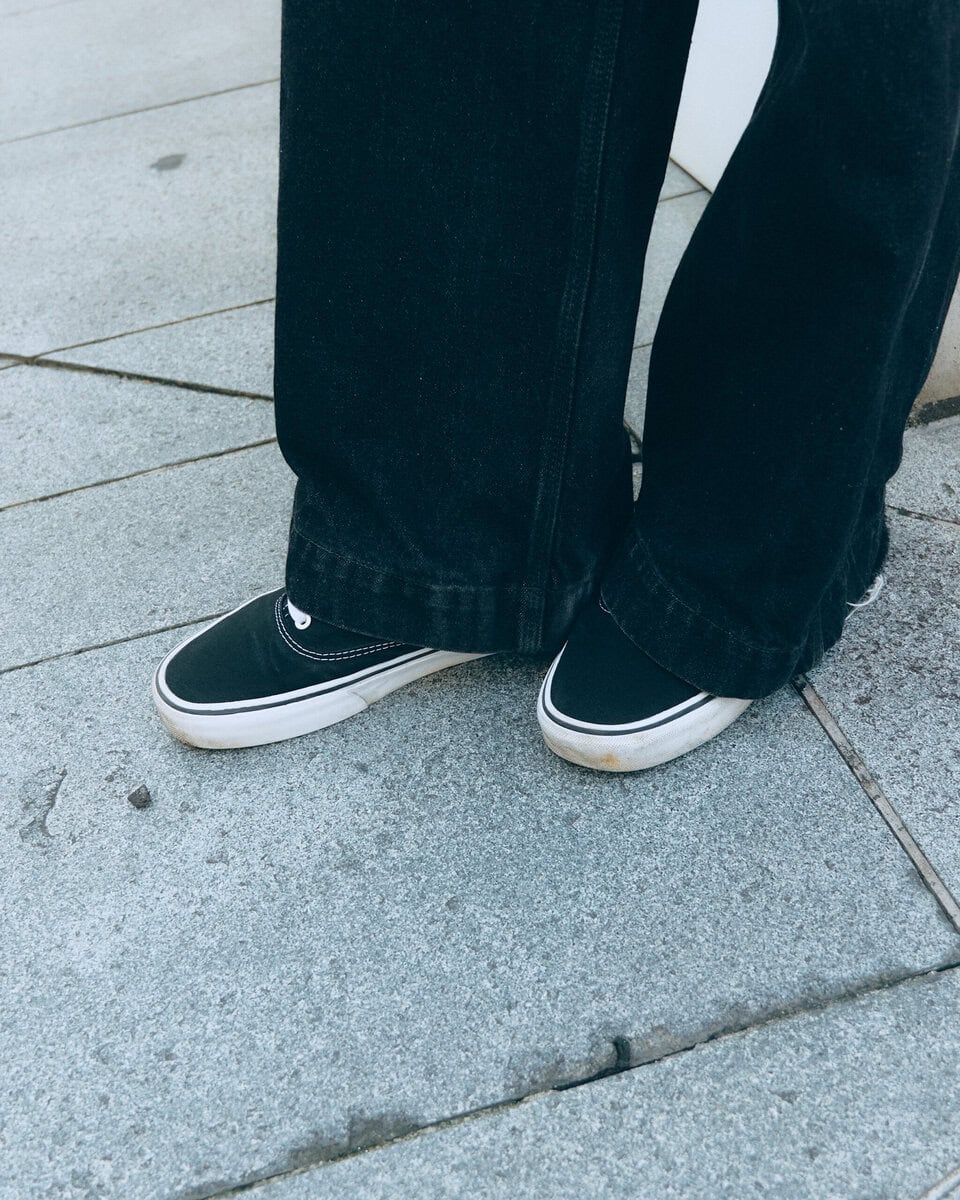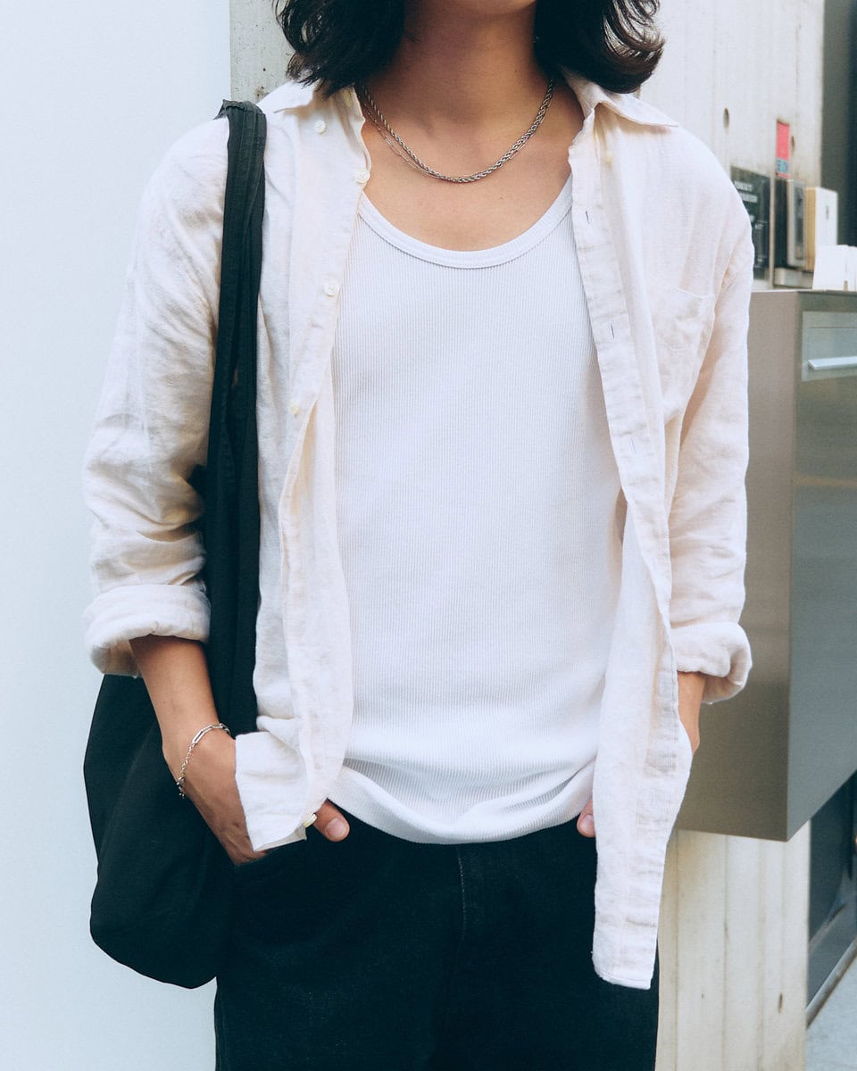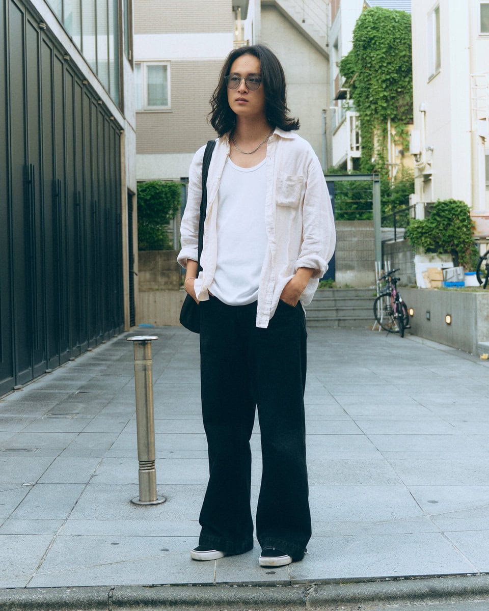 【スナップ】白のリネンシャツ&タンクと黒フレアパンツの対比が際立つ、チルい70年代コーデ