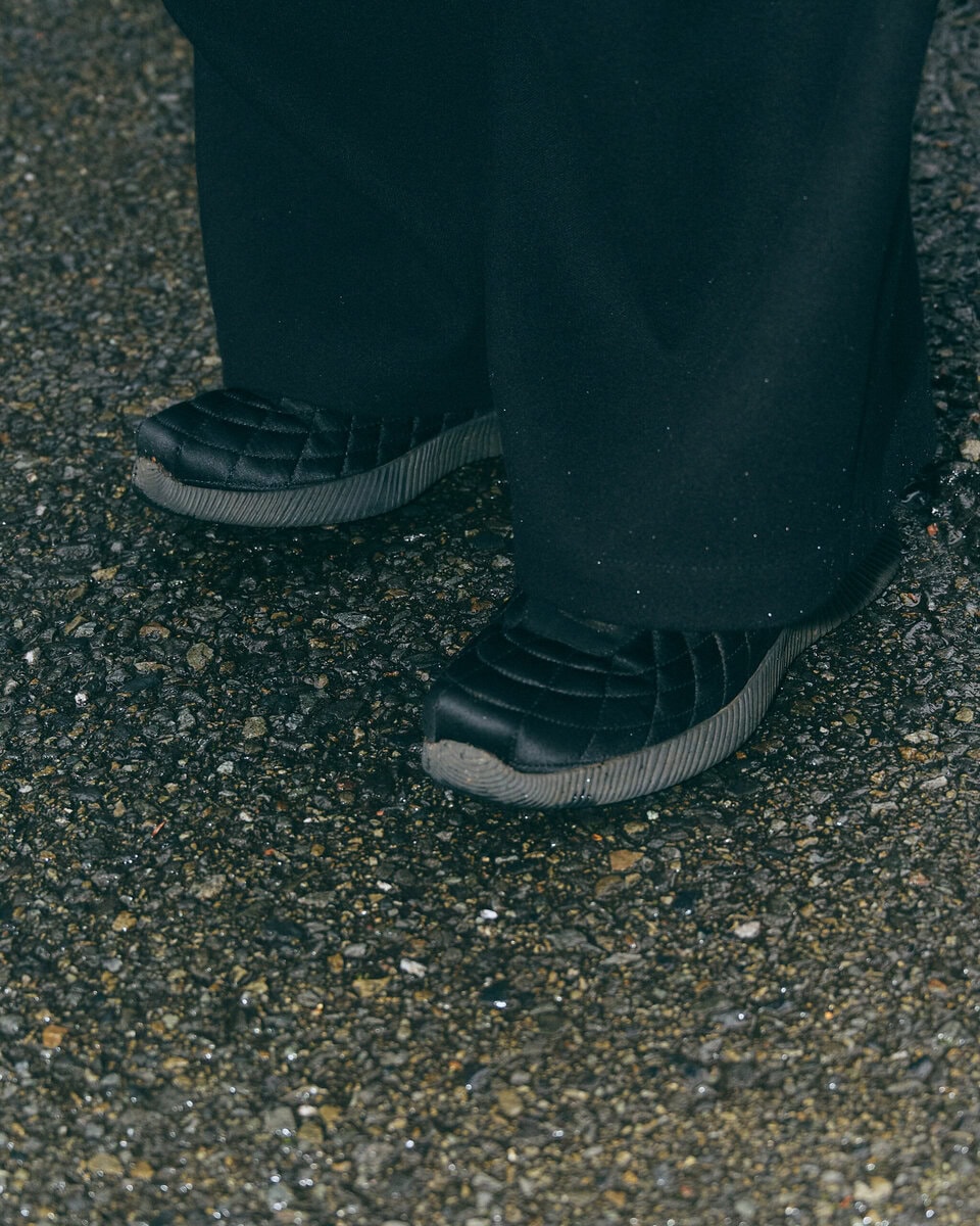 【スナップ】全身モノトーンでも、質感の異なる素材の組み合わせで奥行きを創出。さらに目を引く「挿し色オレンジ」
