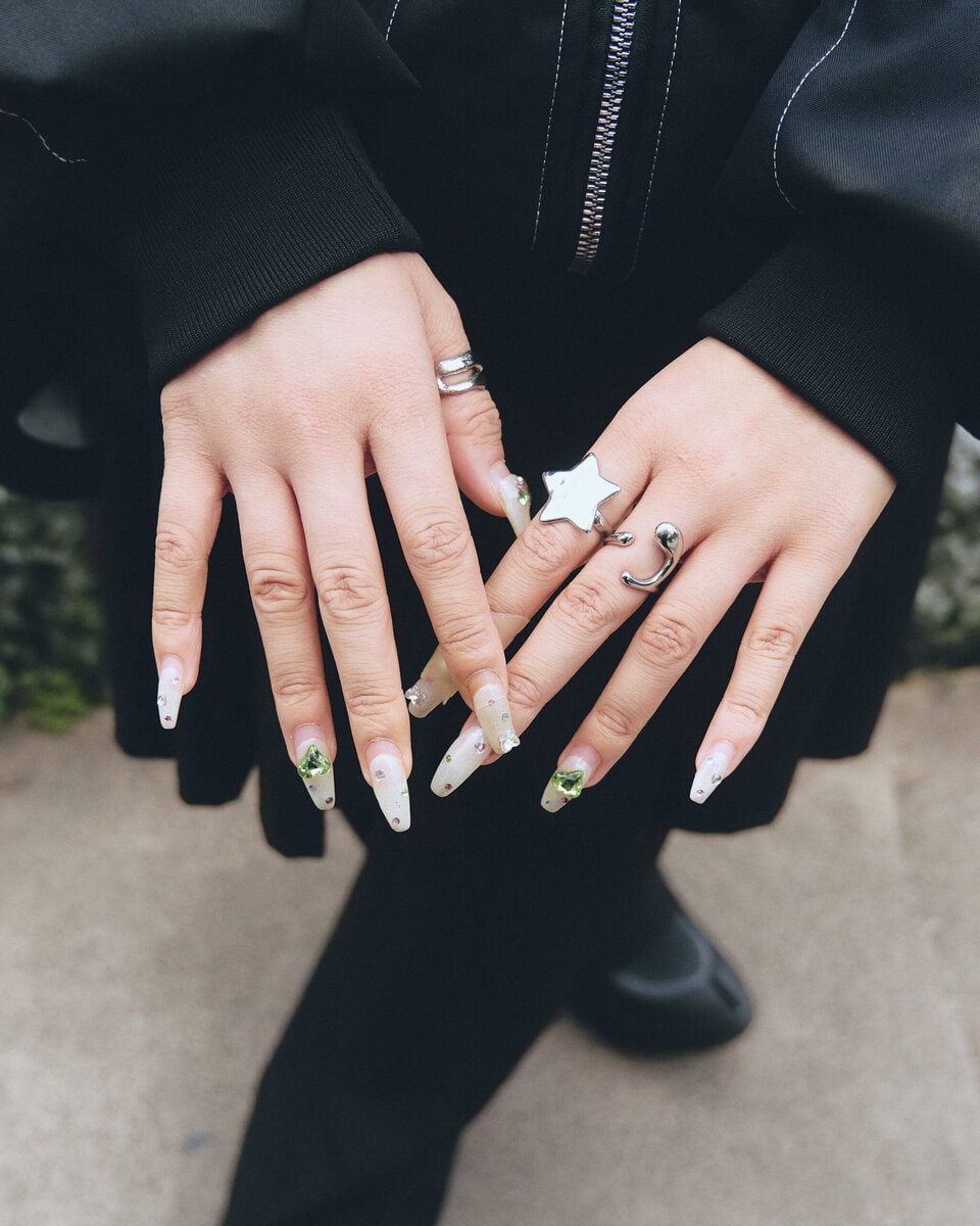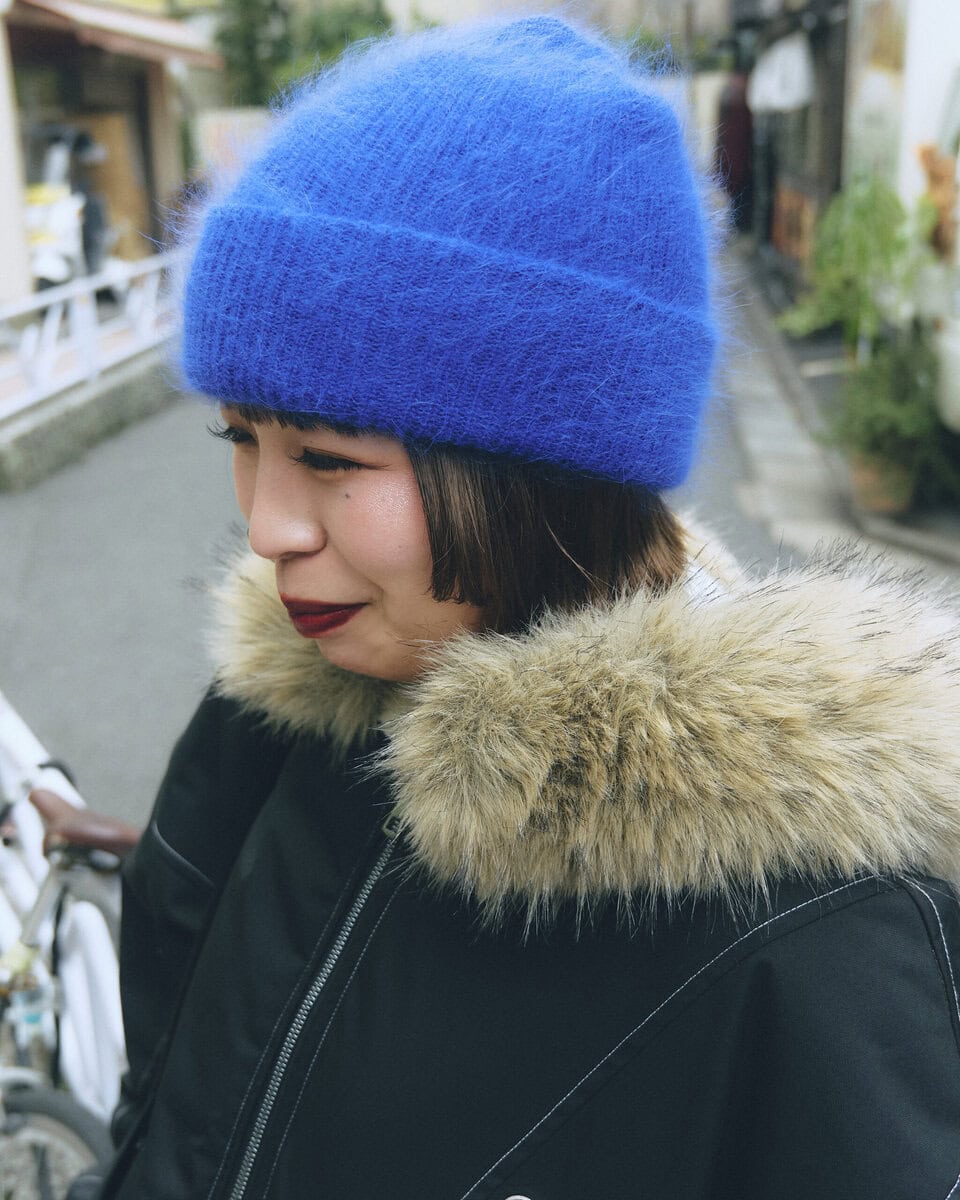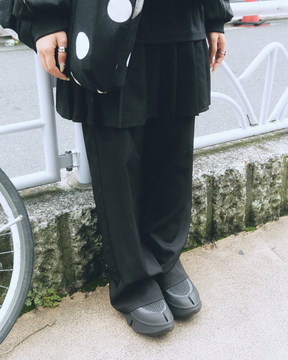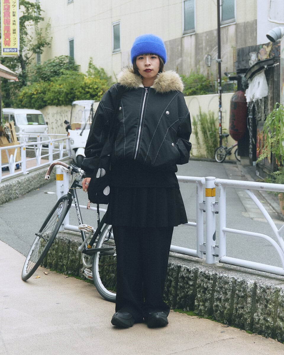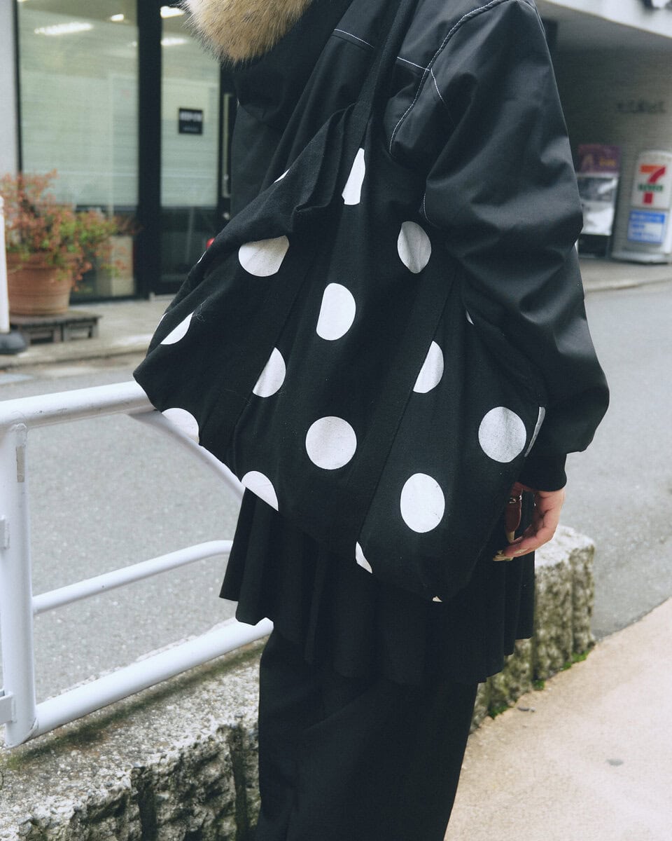 【スナップ】自身が手掛けるブランド〈レイン〉を中心にコーディネイト。”雨粒”を思わせるブルーとドットも印象的