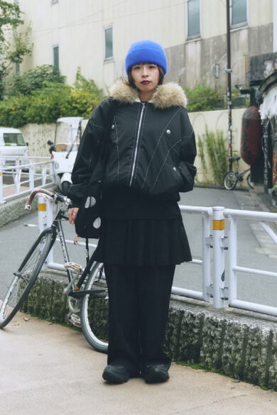 【スナップ】自身が手掛けるブランド〈レイン〉を中心にコーディネイト。”雨粒”を思わせるブルーとドットも印象的