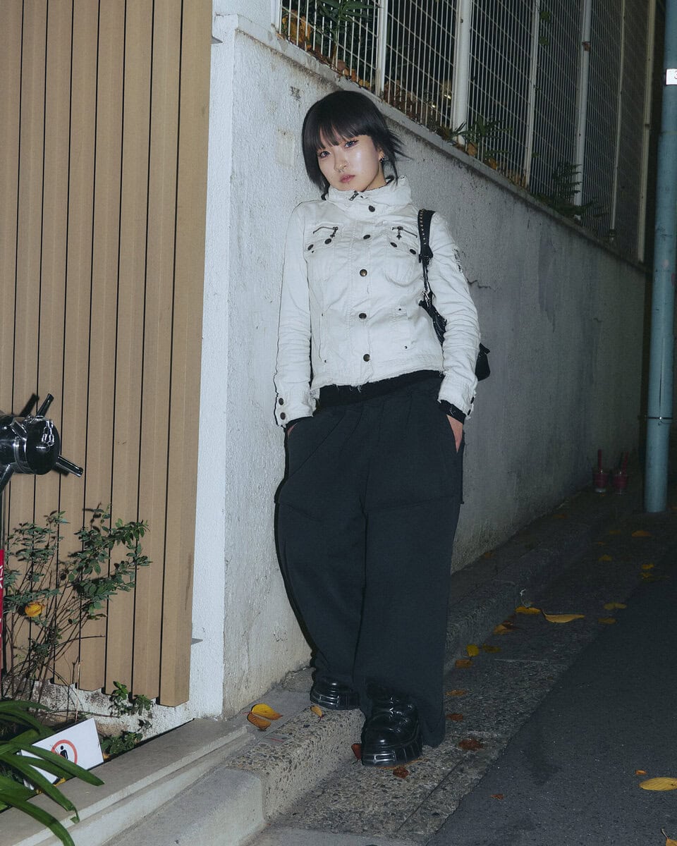 今日の着こなしポイント:パンツで裾を溜めるのが好きなので、Newrockを履いてみました。トップスのギミック感もお気に入りです。