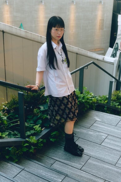 【スナップ】柄スカート、ロザリオ、細身のシューズ…数々のフェミニン要素の花柄メンズシャツを合わせて