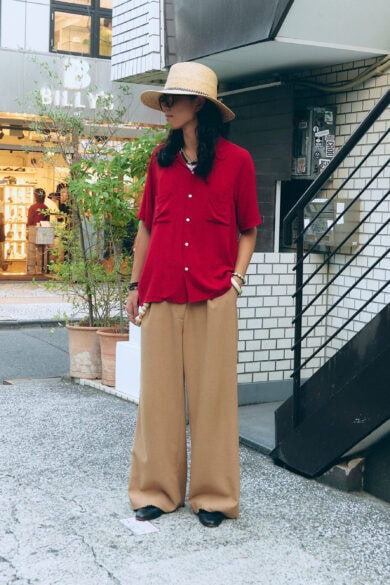 【スナップ】真紅のオープンカラーシャツとベージュのワイドパンツ…独特の生地感により生まれたシルエットが洒脱なムード